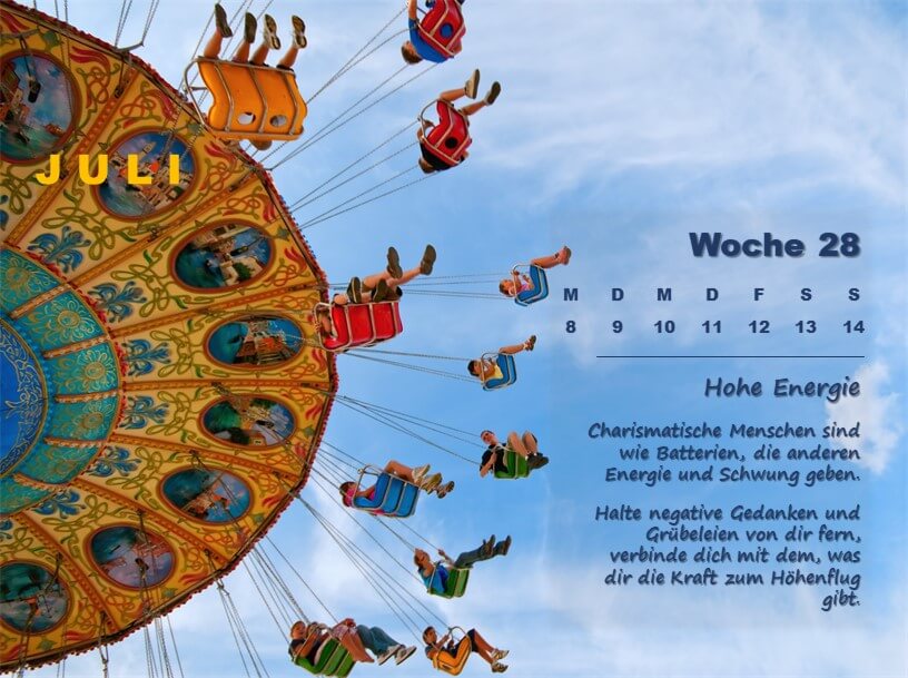 Das steht im Kalenderblatt von Woche 28 des Charisma-Kalenders (für 2020 wird es übrigens auch wieder einen geben!). Und wenn du nun jemand bist – wie ich übrigens – der gern über Dinge nachdenkt, der gern hinter die Oberfläche blickt, der gern den Status quo hinterfragt, der die „schweren“ Momenten auch braucht, um z.B. produktiv sein zu können (zu schreiben, z.B.), dann kann es schon sein, dass dir dieser Hinweis sauer aufstößt. Deine erste Reaktion ist dann vielleicht: „Leute, die immer nur gut drauf sind, gehen mir auf den Geist! Denn das kann gar nicht echt sein!“